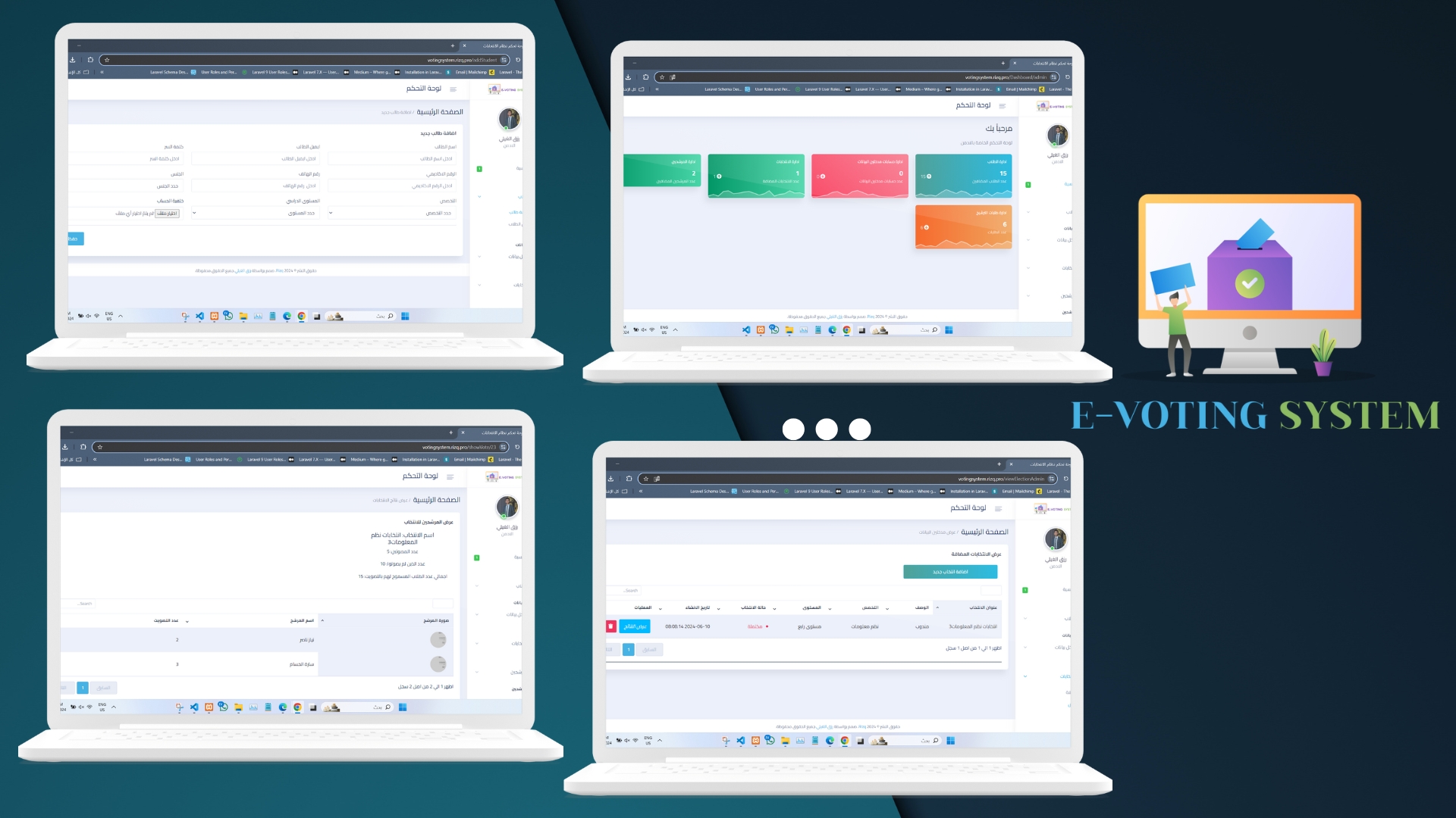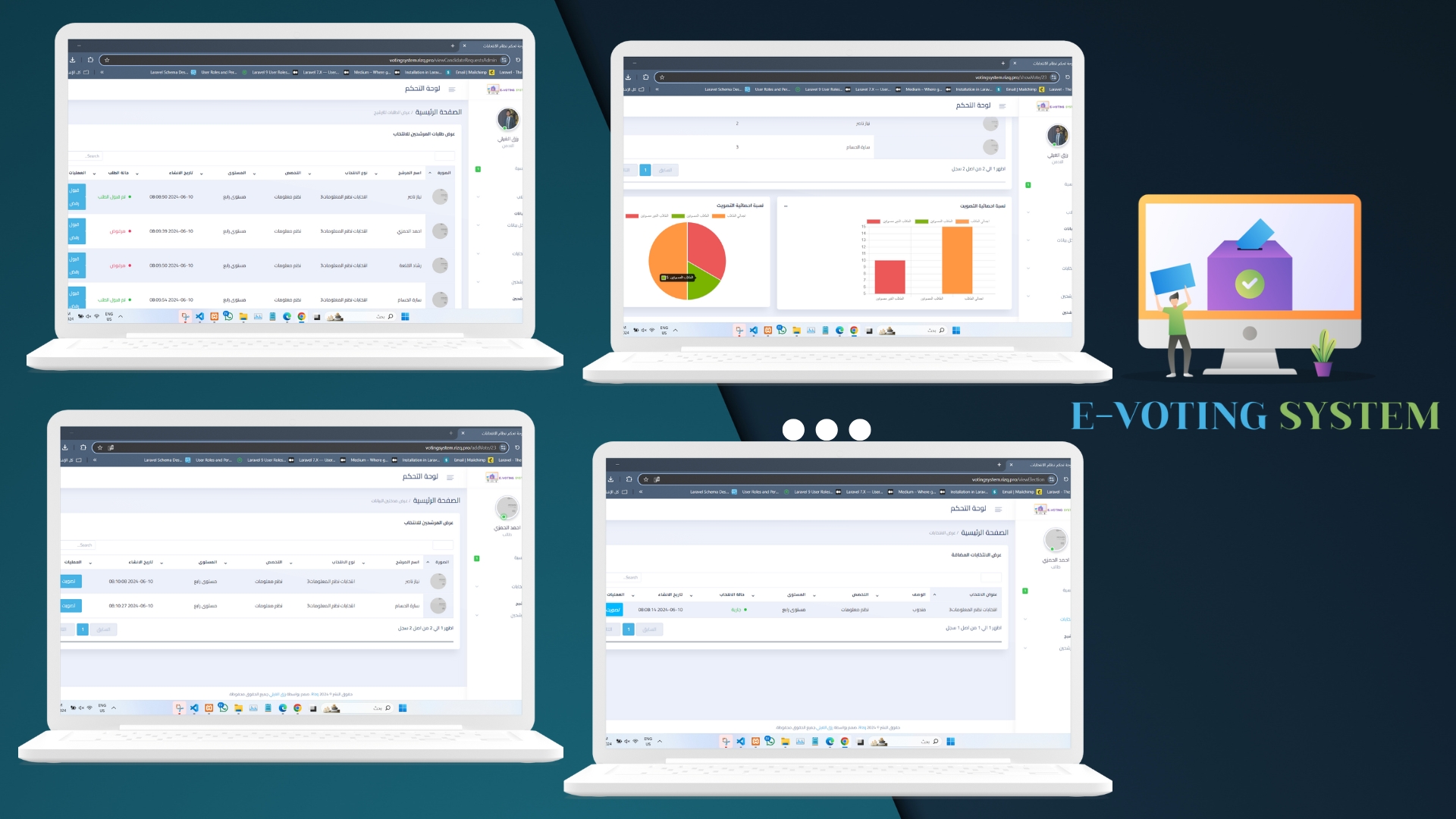 The new Elections and Voting Management website aims to provide a comprehensive platform that enables students to run for student positions and participate in voting on various issues. An easy-to-use interface will be provided that allows students to register and log in, view candidates and available positions, and view election and voting results instantly. The college will be able to significantly improve and simplify the election and voting processes. A mechanism will be provided to verify the identity of voters and candidates correctly, and a mechanism will be provided to prevent manipulation and fraud in the electoral process. All activities related to elections and voting will be recorded in specific records for auditing and review.